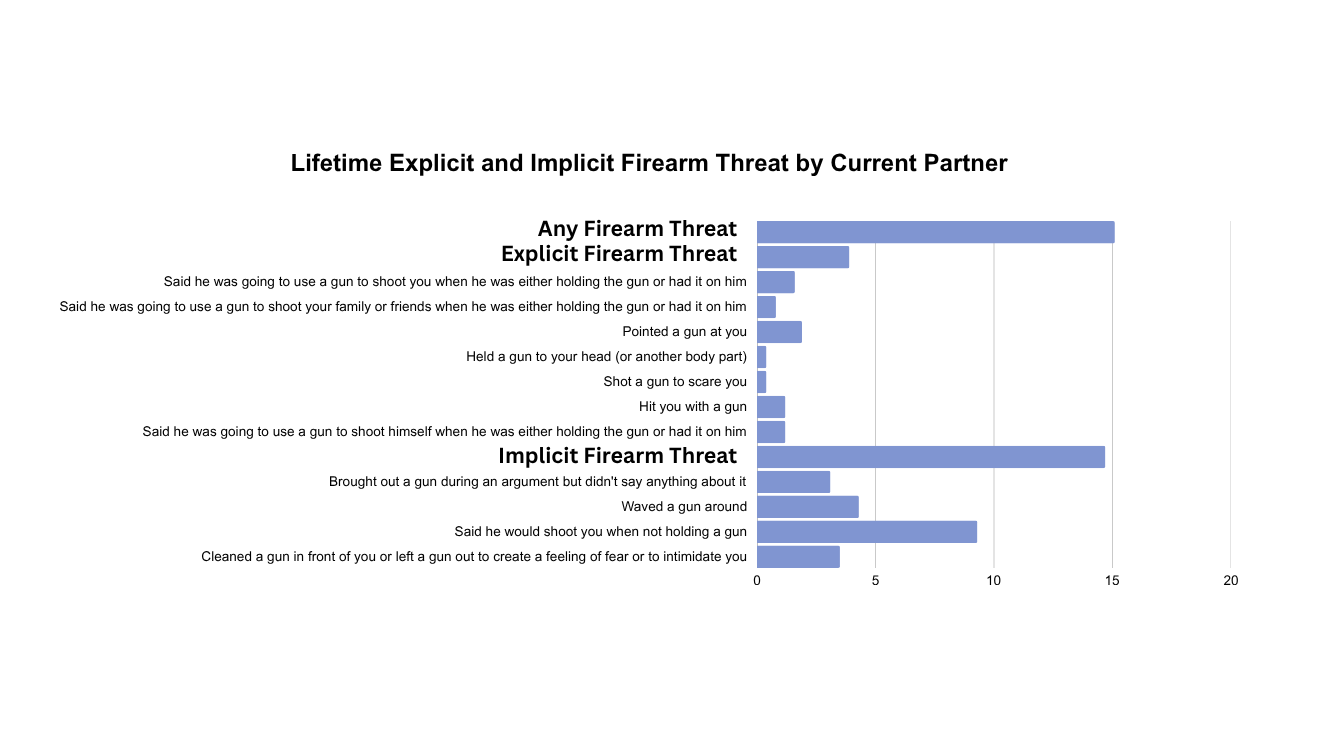 In total, 35 percent of women experienced either implicit or explicit firearm threats by an intimate partner in their lifetime, with an average of nine separate incidents. Explicit threats were direct threats made to the victim with actions or words while the partner was holding a gun or had it on his person, whereas implicit threats were ways in which the partner threatened, coerced, or intimidated a victim with a firearm without an explicit action or without an explicit verbal threat (see figure of lifetime threat endorsement). Fifteen percent of women in this sample also reported having experienced a firearm threat in their current relationship.