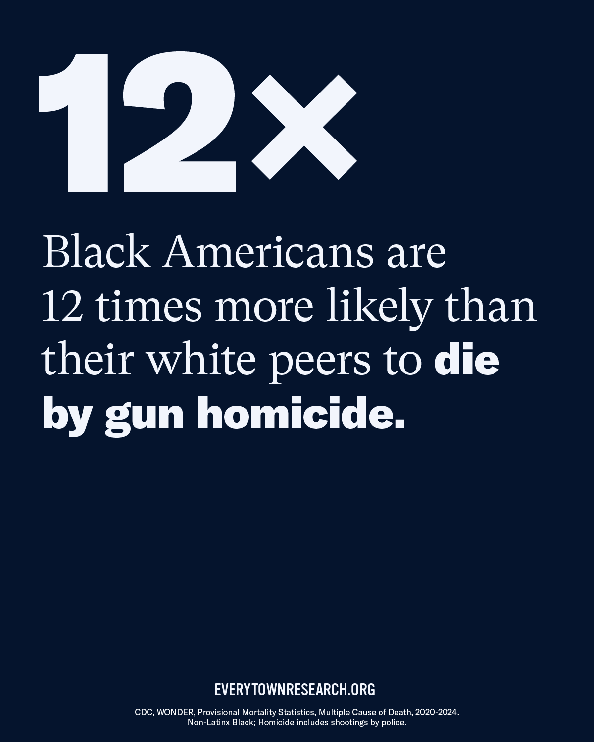 - Black Americans represent the majority of gun homicide victims. In fact, Black people in the US are 12 times more likely than white people to die by gun homicide.14Everytown Research analysis of Centers for Disease Control and Prevention, National Center for Health Statistics. WONDER Online Database, Provisional Mortality Statistics, Multiple Cause of Death (accessed December 16, 2025). Average: 2020 to 2024. Rates are age-adjusted. Black and white defined as non-Latinx origin. Homicide includes shootings by police.